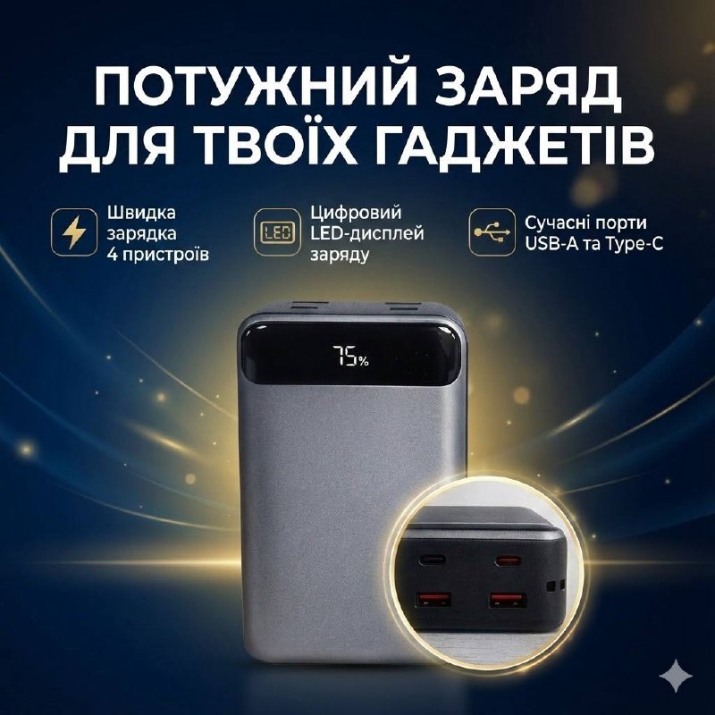 Повербанк — портативний зарядний пристрій великої ємності для автономної підзарядки смартфонів, планшетів та іншої мобільної електроніки. Підходить для використання вдома, у поїздках і в ситуаціях, коли немає доступу до розетки.